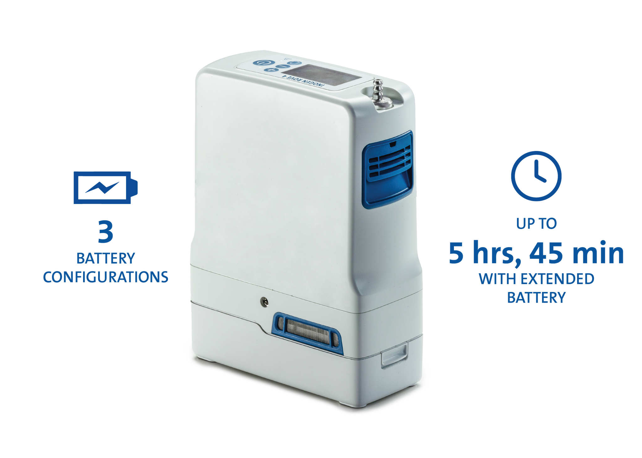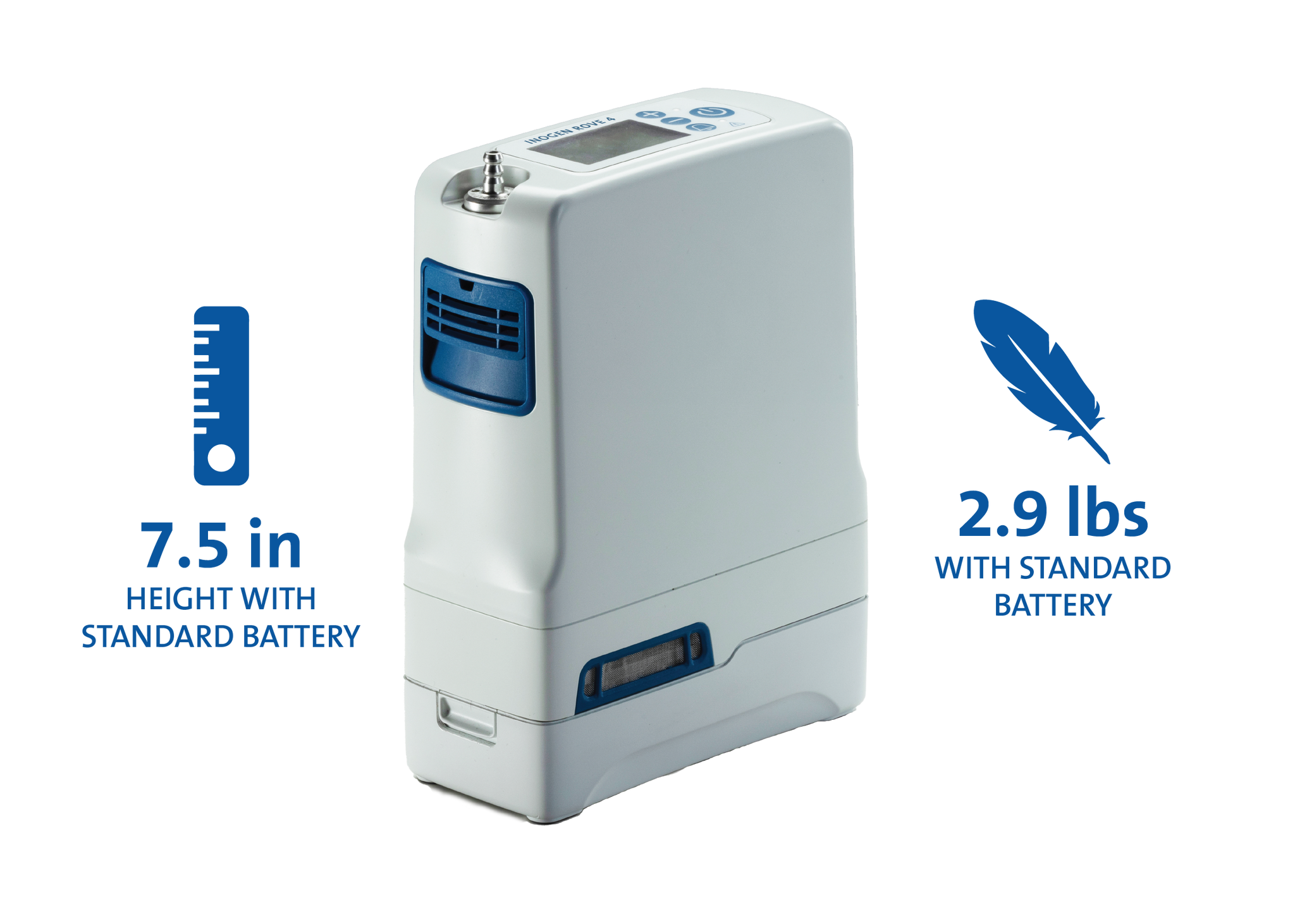 22.9 lbs when used with standard battery delivering up to 840 mL/min of medical-grade oxygen. Tested against current POCs available on the market. Data on file and available upon request.